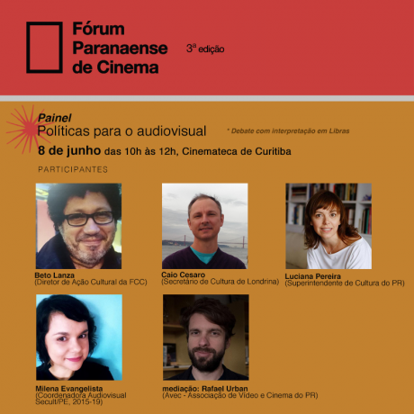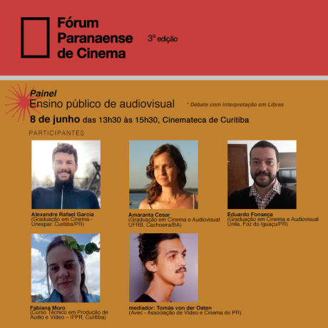 A terceira edição do Fórum Paranaense de Cinema acontecerá nos dias 07 e o 08 de junho (sexta e sábado), na Cinemateca de Curitiba. A programação é uma realização da Associação de Vídeo e Cinema do Paraná – Avecpr em parceria com o Mestrado em Cinema e Artes do Vídeo Unespar e o 8° Olhar de Cinema – Curitiba Int’l Film Festival e tem entrada franca. Os presentes em pelo menos duas atividades poderão solicitar declaração de participação com validade para horas complementares.Em três mesas, gestores, professores e responsáveis pela programação de espaços públicos de cinema em Curitiba e cidades do interior do estado debaterão em paralelo à experiência de profissionais de outros estados brasileiros. Os convidados, além de apresentarem o trabalho junto ao órgão que representam e participarem de debate, buscarão responder a duas perguntas: o que se entende por política pública para o audiovisual em sua instituição e como a instituição que ele/ela representa responde de modo concreto à essa demanda.