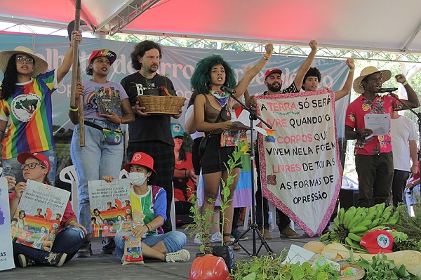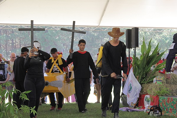 . O tradicional momento místico realizado pelo MST em seus eventos abriu o dia. A intervenção demarcou as enormes diferenças entre o agronegócio e a produção agroecológica da agricultura familiar. De um lado, veneno, desmatamento, fome, condições degradantes do trabalhador e enriquecimento de poucos, representados por nomes de multinacionais do agrotóxico, uso de motossera e cruzes pretas. . Do outro lado, a diversidade e a força da luta do povo do campo e da cidade, representadas por mulheres e homens, jovens e idosos, povo negro, LGBTQIAP+. Também o respeito ao meio ambiente, o cuidado com o bem estar social e a saúde das pessoas, ilustrados pela fartura do modo de produção agroecológico e bandeiras de luta de movimentos sociais que travam a batalha de organizar o povo oprimido. .