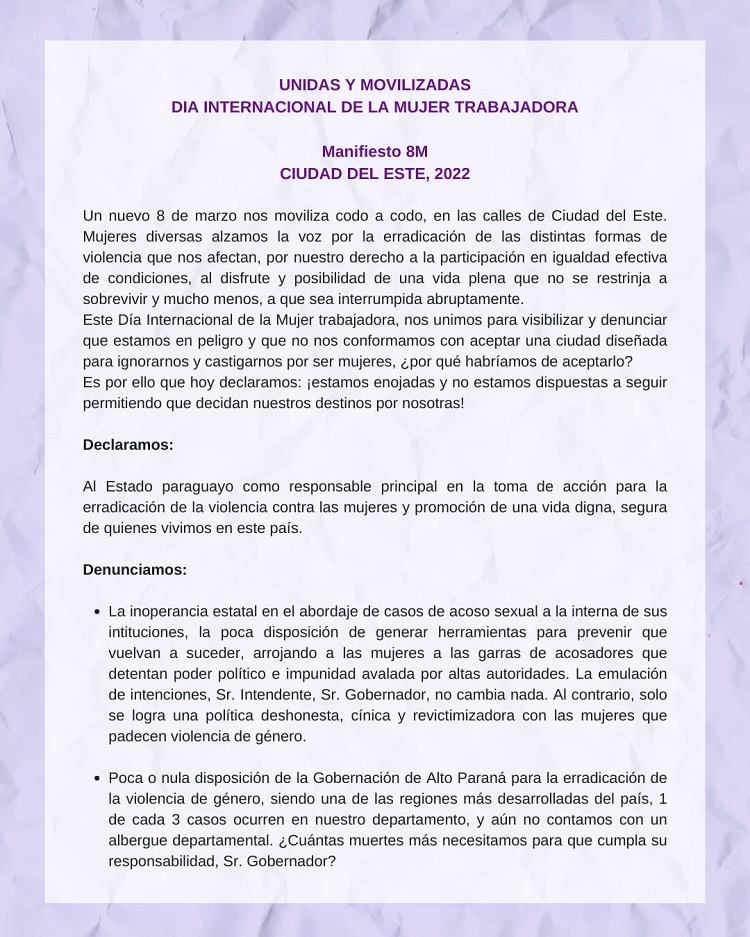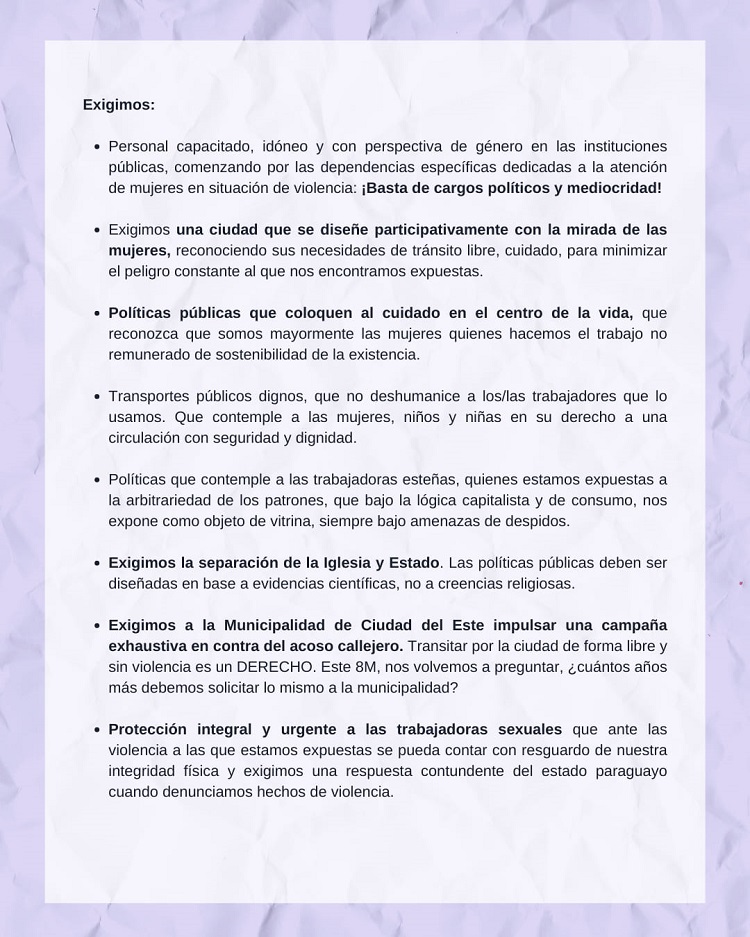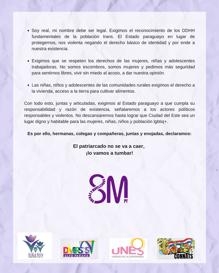 Registro fotográfico produzido pelo coletivo feminista Kuña Poty, que atua em Ciudad del Este. . Veja todas as 100 fotos da manifestação em Ciudad del Este, PY, clicando aqui. Conheça o Manifesto conjunto das entidades organizadoras do 8 de Março em Ciudad del Este, PY . Fonte: Kuña Poty