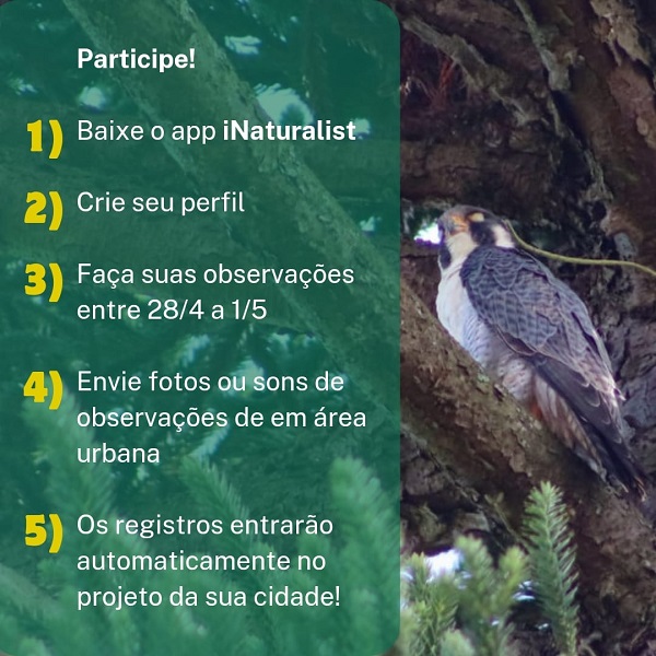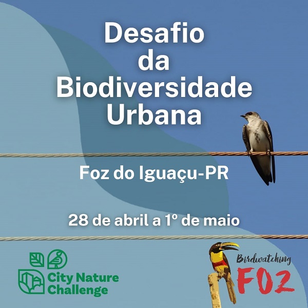 . De 28 de abril a 1 de maio, vai acontecer o evento global Desafio da Biodiversidade Urbana, ou City Nature Challenge (CNC), em inglês. Para este ano, o Birdwatching Foz, o Parque das Aves, a Unila e o Instituto Ideia Ambiental se reuniram para capacitar a comunidade no uso da ferramenta iNaturalist, usada para fazer os registros de animais e plantas em ambiente urbano, que entram na competição. .
