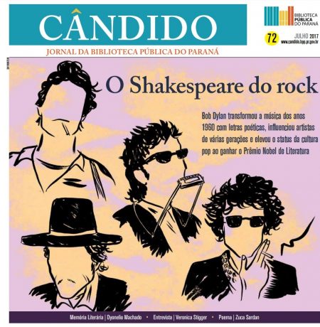 A edição 72, de julho de 2017, do jornal Cândido — editado pela Biblioteca Pública do Paraná — traz um especial sobre a trajetória de Bob Dylan. O americano de Minnesota foi o primeiro compositor a receber, em dezembro de 2016, o Prêmio Nobel de Literatura. Considerado um “artista dos artistas”, a obra de Dylan inspirou inúmeros músicos — dos Beatles a Caetano Veloso, passando por Jimi Hendrix e Raul Seixas, entre outros. O jornalista e escritor Jotabê Medeiros (que prepara a biografia de Belchior, outro artista conhecido pela qualidade de suas letras) traça um perfil de Dylan, com informações sobre a sua formação, repertório e o impacto que sua vasta obra tem causado na cultura ocidental ao longo de meio século. Em um segundo texto, Medeiros mostra como o legado de Dylan foi assimilado por artistas como Patti Smith, Leonard Cohen e Gil Scott-Heron. O especial ainda traz uma lista comentada com dez álbuns do “Shakespeare do rock” e uma análise do diálogo de autores brasileiros com a obra de Dylan. Outro destaque do Cândido 72 é uma reportagem que recupera o percurso do escritor Dyonelio Machado (1895–1985), que estreou há 90 anos com o livro de contos Um pobre homem. Mais conhecido pelo romance Os ratos (1935), Machado escreveu 19 livros em que problematiza angústia e perseguição, entre outros temas. A edição também conta com uma entrevista com Veronica Stigger, uma das escritoras brasileiras contemporâneas mais premiadas, identificada por borrar as fronteiras entre os gêneros literários, transitar pelas artes visuais e se manifestar nas redes sociais. Na seção Cliques em Curitiba, um ensaio do fotógrafo Eduardo Vernizi e, entre os inéditos, poemas de Zuca Sardan, Paulo Scott e Dennis Radünz, dois textos líricos de Leonard Cohen traduzidos por Fernando Koproski, além de um conto de Carlos Alberto Sanches. Serviço – O Cândido tem tiragem mensal de 10 mil exemplares e é distribuído gratuitamente na Biblioteca Pública do Paraná e em diversos pontos de cultura de Curitiba. O jornal também circula em todas as bibliotecas públicas e escolas de ensino médio do Estado. É enviado, pelo correio, para assinantes a diversas partes do Brasil. O site também traz conteúdo exclusivo, como entrevistas, vídeos e inéditos.