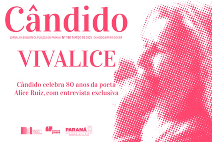 A edição nº 168, de março, do jornal Cândido, “Vivalice”, traz em destaque uma entrevista exclusiva com a escritora paranaense Alice Ruiz, que completou 80 anos em janeiro. Conhecida por suas poesias e letras de música, em colaboração com diversos artistas da MPB, a autora recebeu a equipe do jornal em sua casa para contar sobre sua trajetória, processo de escrita e relação com diversos formatos de literatura. Como complemento do conteúdo especial, a retranca traz uma seleção de livros e discos de Alice, em uma “linha do tempo”.