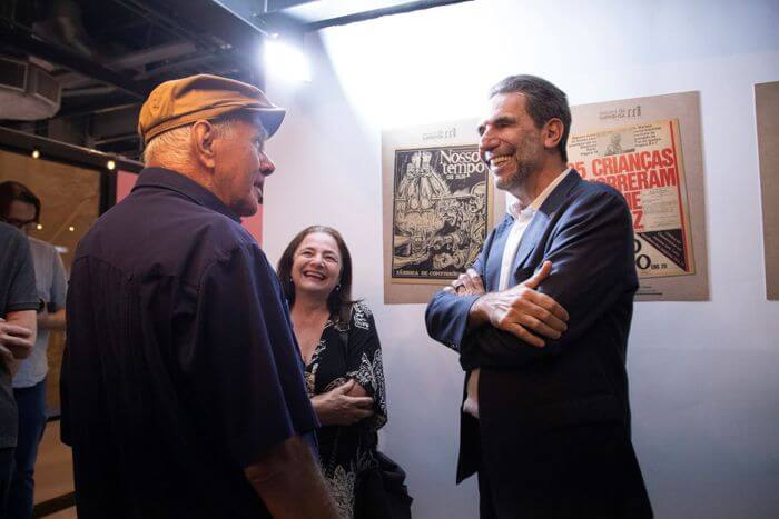 Na exposição, diretor-geral brasileiro da Itaipu, Enio Verri; professora Ivanete Schumann; e o jornalista Aluízio Palmar — foto: Roberto Lemos/Museu da Imprensa