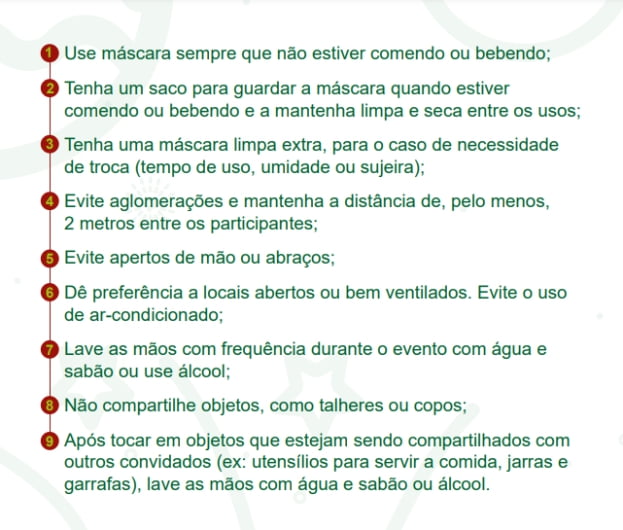Além dessas, evitar aglomerações e manter uma distância de, pelo menos, 2 metros entre os participantes são fundamentais, assim como evitar apertos de mão ou abraços; dar preferência a locais abertos ou bem ventilados, evitar o uso de ar-condicionado e lavar as mãos com frequência durante o evento com água e sabão ou usar álcool.