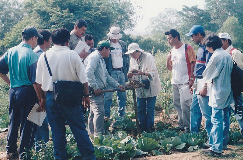 Pesquisadora em campo com jovens camponeses / Foto: Acervo/Ana Maria Primavesi