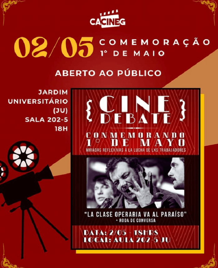 Em comemoração ao 1 de Maio, Dia Internacional dos Trabalhadores, o Centro Acadêmico de Cinema Gomes e Giardina — UNILA promove uma sessão debate do filme “A Classe Operária Vai ao Paraíso”, do diretor italiano Elio Petri. A exibição do filme ocorrerá no dia 2 de maio (sexta-feira), às 18 horas, na sala 202-5 do campus Jardim Universitário da Unila. A programação, gratuita, é aberta ao público externo da Universidade.