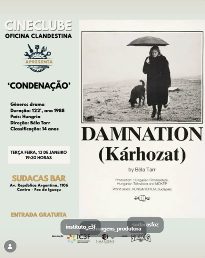O cineclube iguaçuense inicia sua programação anual nesta terça-feira (13), a partir das 19h30, no Sudacas Bar. O filme escolhido é “Condenação” (Damnation), do diretor húngaro Béla Tarr. Com duração de 122 minutos e classificação para a faixa de 16 anos ou mais, a película será exibida com entrada franqueada. Sinopse – Karrer vive em […]