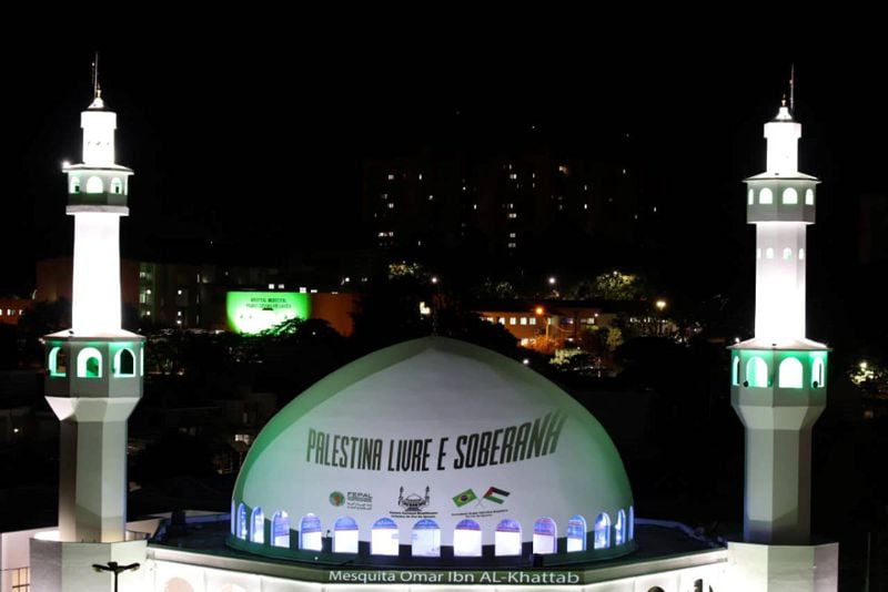 Em ato público na sexta-feira, 14, a comunidade árabe em Foz do Iguaçu prestou solidariedade ao povo palestino e condenou os ataques militares promovidos por Israel. Foram projetadas, na cúpula da Mesquita Omar Ibn Al-Khattab, as bandeiras do Brasil e da Palestina, além de mensagens de apoio.