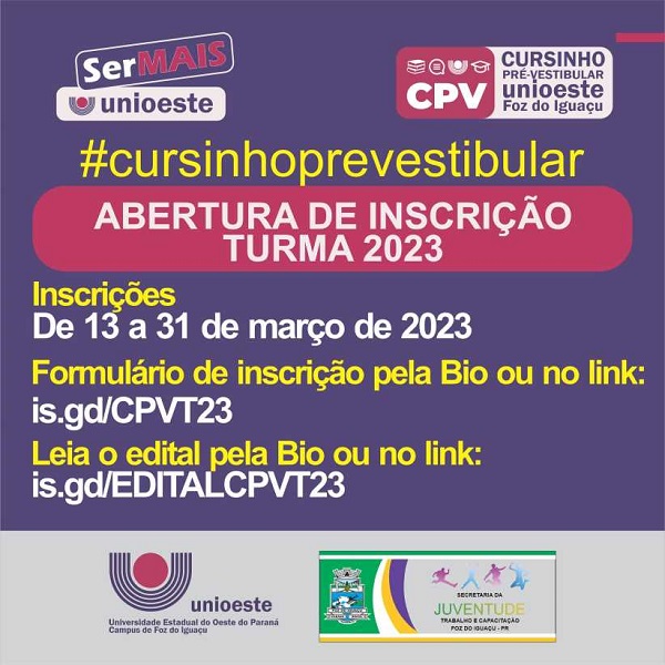 As aulas serão no campus da universidade e em mais três bairros populares; formulário para cadastro é online. . . Paulo Bogler – H2FOZ . Gratuito, o Cursinho Pré-Vestibular da Unioeste/Foz (Universidade Estadual do Oeste do Paraná) está com inscrições abertas para 240 vagas, até 31 de março, pelo formulário on-line no link: is.gd/CPVT23. A formação […]
