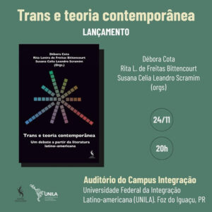 20h15 – Lançamento do livro: Trans e Teoria Contemporânea: Um debate a partir da literatura latino-americana. Orgs.: Profa. Dra. Débora Cota; Profa. Dra. Rita Lenira Bittencourt e Profa. Dra. Susana Celia Leandro Scramim