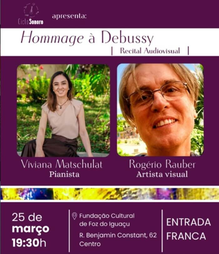No dia 25, quarta-feira, o projeto de extensão Ciclo Sonoro. do curso de Música da UNILA, apresenta um recital que homenageia o legado poético de Claude Debussy. No programa, as 12 peças do Primeiro Caderno de Prelúdios para Piano (1909–1910) ganham uma nova experiência sensorial: enquanto a pianista Viviana Matschulat conduz a interpretação musical, projeções de pinturas do artista visual Rogério Rauber ampliam o diálogo entre música e artes visuais. A apresentação ocorrerá a partir das 19h30, na sede da Fundação Cultural, com entrada gratuita.
