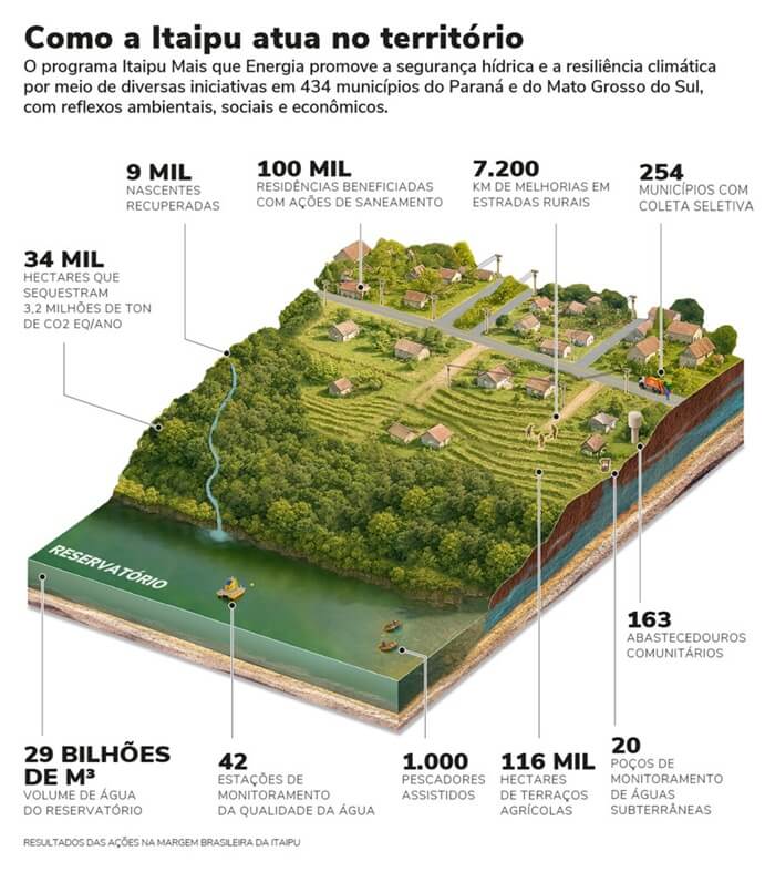 No Brasil, essas ações estão alinhadas com as políticas públicas do governo brasileiro e abrigadas no programa Itaipu Mais que Energia. As iniciativas abrangem 434 municípios (399 no Paraná e 35 no sul do Mato Grosso do Sul) e se interconectam de forma a aumentar a infiltração de água no solo e proteger nascentes, cursos d’água e o reservatório do aporte de sedimentos. De quebra, as ações contribuem para aumentar a resiliência climática nas culturas agrícolas, pois com mais água no solo as plantas têm mais chances de resistir aos períodos de estiagem.