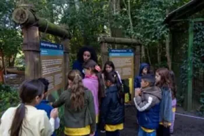 Ao chegar ao Refúgio Biológico Bela Vista, o grupo percorreu uma trilha e visitou recintos onde vivem animais resgatados ou ameaçados de extinção. Os alunos, de 8 e 9 anos, vibraram ao avistar aves, mamíferos e répteis.