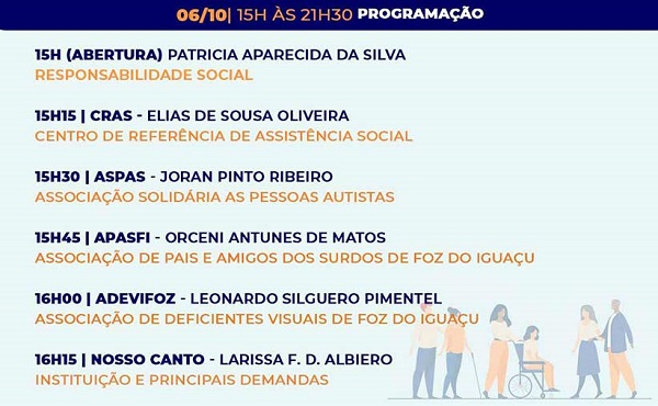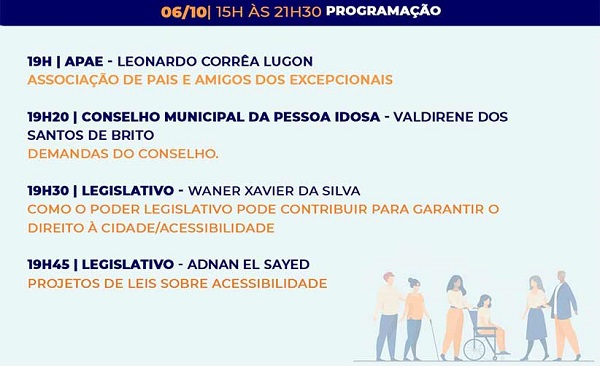 O I Encontro Temático dos Direitos da Pessoa com Deficiência e da Pessoa Idosa começará às 15h e se estenderá ao longo de todo o dia, com breves apresentações das instituições sobre o trabalho que desenvolvem e suas principais necessidades. Confira a programação completa:
