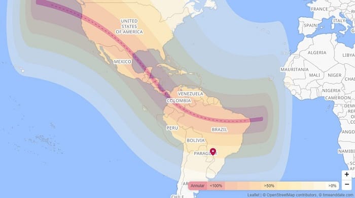 No céu de Foz do Iguaçu, especificamente, a Lua encobrirá a visão de 29,82% do Sol, diminuindo o brilho do astro em cerca de 30%. O início na fronteira, de acordo com a plataforma Time and Date, está previsto para as 15h36, com pico às 16h45 e término às 17h46.