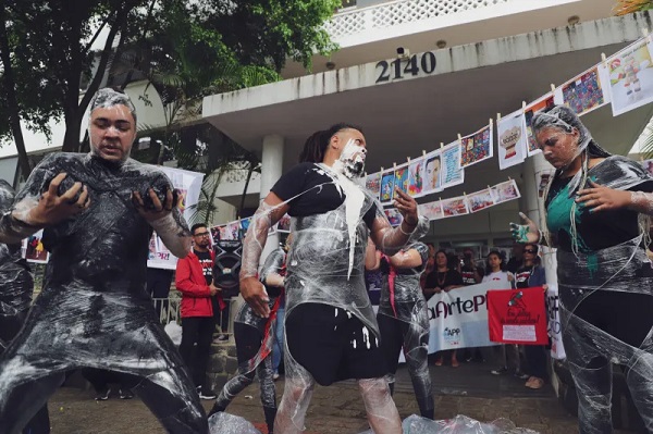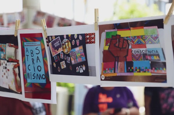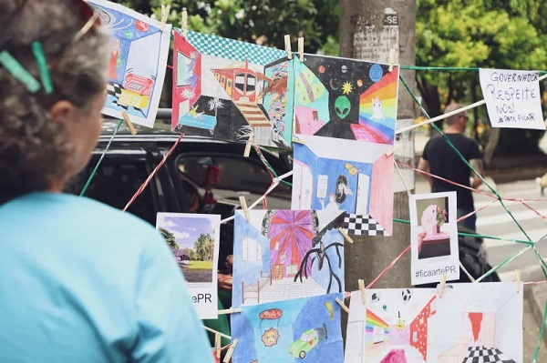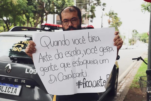 . Junto aos gritos de ordem, a manifestação apresentou algo diferente de outras mobilizações: Artes de estudantes enviadas por educadores(as) tornaram a ação colorida e potente, demonstrando a necessidade da manutenção da disciplina, que é fundamental no desenvolvimento intelectual e criativo dos estudantes. .