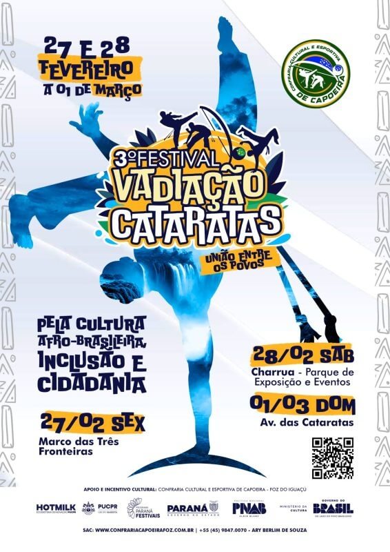 Encontro de capoeira promoverá três dias de ginga, oficinas e palestras em Foz do Iguaçu, de sexta-feira a domingo (27 a 1.º). É o 3.º Festival Vadiação Cataratas 2026, que tem como slogan a união entre os povos, com presença de mestres convidados, oficinas, rodas e apresentações. .