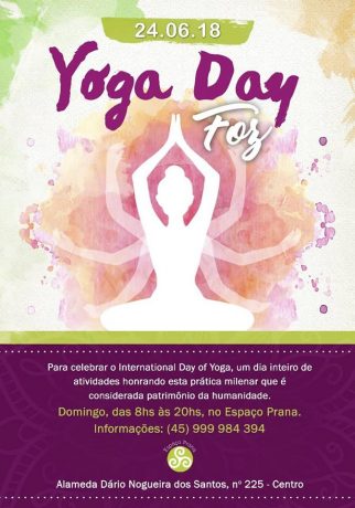 [box] YOGA DAY FOZ – Dia 01 de julho (nova data) – Programação – . . 8h – Acolhida e Aquietamento 8h30 – Vinyasa para os 7 Chakras – Com Caroline Echeverria – Espaço Prana 9h30 – Asanas com Alinhamento – Com Estela Valiati – Sadhana Espaço de Yoga 10h – Meditação Guiada na Floresta – Com Luciana Melo – Espaço Energia 11h – Yoga para crianças – Com Aline Rezende – Samadhi Corpo e Mente 11h – Yoga em Dupla: quebrando a inércia e indolência – Com Mayara Brecher – Casa Florir Intervalo para Almoço 14h – Bate papo sobre “Ayurveda, a ciência da vida” – Com Mônica Nasser 15h – Meditação Guiada: Chakras – autoavaliação e desbloqueio consciente – Dhayse Sandoval – Sadhana Espaço de Yoga 16h – Esforço e Relaxamento nas Posturas – Denise Gonzalez – Casa Florir 17h30 – Encerramento e Kirtan – Guru Maharaj Bhaktibusana Swami Iskcon – Paraguai[/box]