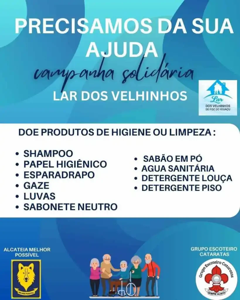 De H2Foz / Por Paulo Bogler Os lobinhos do Grupo Escoteiro Cataratas — 79/PR pedem o apoio da comunidade por meio da campanha de arrecadação para ajudar o Lar dos Velhinhos em Foz do Iguaçu. São recebidos produtos de higiene pessoal e limpeza.