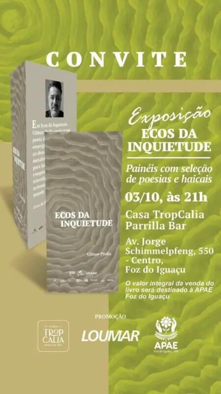 Exposição Ecos da Inquietude Data: 3 de outubro (sexta-feira) Horário: 21h Local: Casa TropCalia Parrilla Bar (Avenida Jorge Schimmelpfeng, 550, centro) *Toda a renda da venda do livro será revertida para a APAE de Foz do Iguaçu.