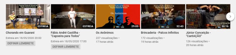 A Rede Regional de Cultura e Patrimônio da Bacia do Paraná 3 promove o Festival Cultural Virtual do Oeste do Paraná durante a quarentena como forma de apoio aos artistas da região, que nesse momento de distanciamento social tem suas possibilidades de trabalhos reduzidas. Os trabalhos que estão sendo apresentados passaram por uma seleção que envolveu centenas de inscritos.