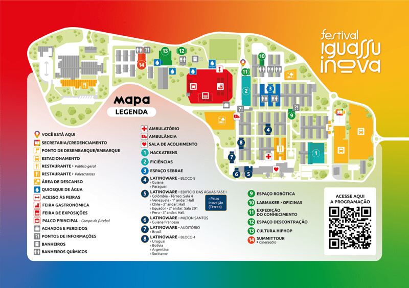O Festival Iguassu Inova, um dos maiores festivais de inovação e tecnologia do Paraná, está prestes a começar. Para garantir que você aproveite cada momento dessa experiência, confira as localizações dos principais palcos e espaços. Assim, você pode se planejar e chegar com facilidade aos locais das palestras, atrativos e exposições que fazem parte da programação, promovida entre os dias 27 e 30 de novembro, no Itaipu Parquetec, em Foz do Iguaçu.