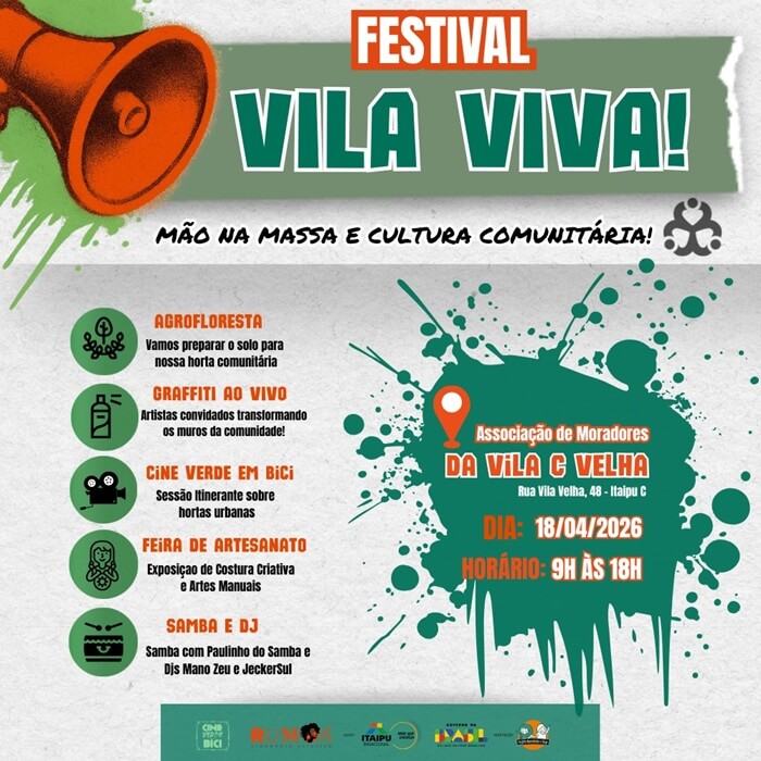 Festival Vila Viva: Mão na Massa e Cultura Comunitária Data: 18 de abril (sábado) Horário: das 9h às 15h (programação) | até 18h (confraternização) Local: Associação de Moradores da Vila C Velha Endereço: Rua Vila Velha, 48 – Itaipu C – Foz do Iguaçu Atividade gratuita e aberta à comunidade