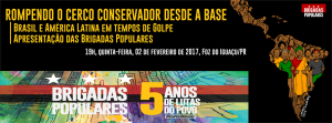 O coletivo de lutas sociais ‘Brigadas Populares” promove nesta quinta-feira, 02, às 19 horas, no auditório da Fundação Cultural, o debate “Rompendo o cerco conservador desde a base – Brasil e América Latina em tempos de golpe”. O diálogo sobre a conjuntura social e política no país e no continente é aberto para toda a comunidade e faz parte da programação da assembleia nacional das brigadas, que acontece em Foz do Iguaçu. Organização política presente em diversos estados brasileiros, as Brigadas Populares encampam mobilizações em torno de temas como ocupações urbanas, movimento comunitário ou de favelas, movimento sindical e a luta contra o machismo, o racismo e a LGBTfobia, entre outras pautas. Enfatizando a resistência popular permanente, as brigadas completaram cinco anos de atividades em setembro de 2016. Durante o debate público, haverá espaço para a apresentação da seção de Foz do Iguaçu das Brigadas Populares. O objetivo é compartilhar o programa, as práticas e a forma de atuação do movimento. O encontro ainda visa a intercambiar experiências entre militantes e ativistas sociais da região das Três Fronteiras, que ultrapassem os limites impostos pela agenda eleitoral, frente institucional à qual entregou-se parte considerável das chamadas forças de “esquerda”. Entre os dias 3 e 5 de fevereiro, a cidade de Foz do Iguaçu sedia a V Assembleia Nacional das Brigadas Populares (ANBP). O objetivo principal do encontro é definir a linha política da organização para conjuntura que se abriu a partir da do impeachment de Dilma Roussef. Com a participação de militantes de pelo menos dez estados brasileiros, o encontro terá entre os eixos de discussão o trabalho nos territórios e as estratégias de unidade popular.