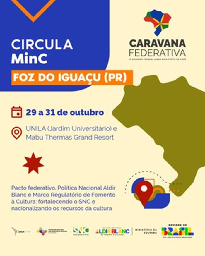 Foz do Iguaçu sediará, de 29 a 31 de outubro, o Circula MinC e a Caravana Federativa. As atividades serão realizadas na UNILA, no Jardim Universitário, e no Mabu Thermas Grand Resort. Os eventos irão reunir gestores públicos, agentes culturais e representantes da sociedade civil para debater temas como o Pacto Federativo, a Política Nacional Aldir Blanc e o Marco Regulatório do Fomento à Cultura.