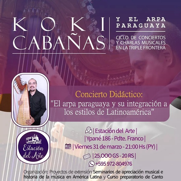 . Dia 31 de março, sexta-feira, quem recebe o Ciclo é a cidade de Presidente Franco, no lado paraguaio. Koki Cabañas apresentará o concerto didático “A Harpa Paraguaia e sua integração aos estilos da América Latina”. Com início marcado para 21 horas (Hora Paraguaia), a atividade acontecerá na casa de espetáculos Estación del Arte. O ingresso, a preço popular, custa 25 mil guaranies (cerca de 20 reais). Informações e reservas pelo whatsapp +595 972.804976.
