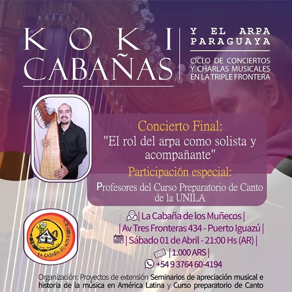 . O encerramento do Ciclo, no dia 01 de abril, sábado, será em Puerto Iguazú, lado argentino, em La Cabaña de los Muñecos. Marcado para iniciar às 21 horas (Horário argentino), acontecerá o concerto “A Harpa como solista e acompanhamento”, que também terá a participação especial de professores da Unila. Ingressos a mil pesos argentinos. Informações e reservas pelo whatsapp +549376460.4194.