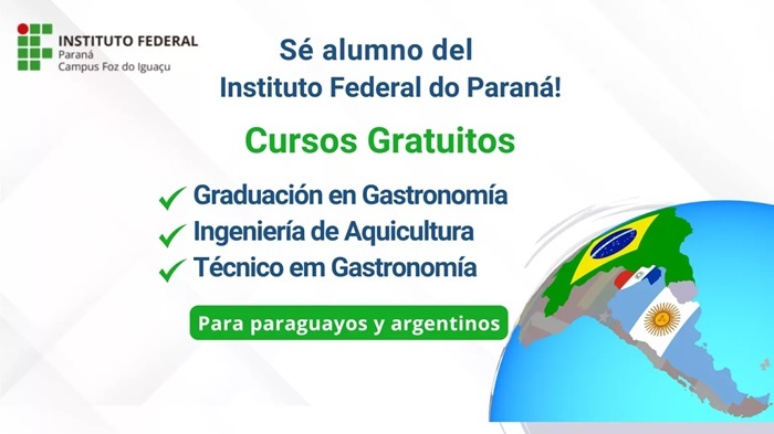 O Instituto Federal do Paraná (IFPR) – Campus Foz do Iguaçu publicou dois editais voltados a selecionar estudantes da Argentina e do Paraguai para estudarem nos cursos gratuitos de Tecnologia em Gastronomia (4 vagas); Engenharia de Aquicultura (4 vagas); ou no curso Técnico em Gastronomia (4 vagas). As inscrições para o Processo Seletivo Simplificado estão abertas de 10/12/2025 a 06/01/2026, por meio do Formulário de Inscrição.