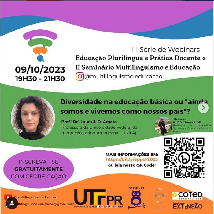 Dia 9 de outubro, às 19 horas, acontece a primeira seção da III Série de Webinars Educação Plurilíngue e Prática Docente e do II Seminário Multilinguismo e Educação, eventos on-line, organizados pelo Departamento de Educação da Universidade Tecnológica do Paraná. Para a primeira atividade da série, a convidada é a professora doutora Laura J. D. Amato, da Unila, que discorrerá sobre “Diversidade na educação básica ou “ainda somos e vivemos como nossos pais?”.