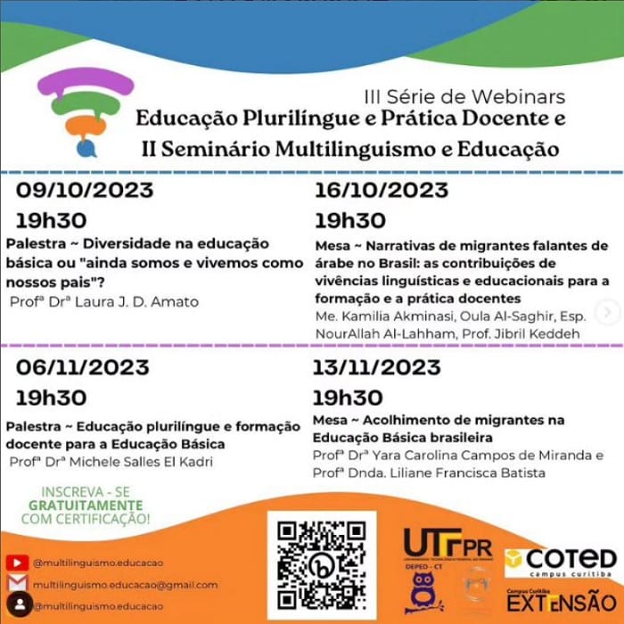 Além da webinar de estreia, outras três serão realizadas em outubro e novembro. Todas elas relacionadas com o projeto de extensão da UTFPR “Línguas, Culturas, Migrações e Educação em Foco”. As atividades são gratuitas e com certificação proporcional à carga horária assistida.