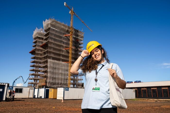 Na imagem em destaque, a estagiária da Itaipu e estudante da Unila Yanki Karen Barreiros da Silva: “Visitar o canteiro de obras do Campus Arandu é uma experiência especial.”
