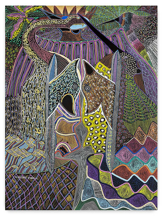 Tem uma questão com a tradição. Então às vezes aparece um grafismo nas obras, aparece uma lenda. Mas ao mesmo tempo também tem uma quebra, porque a arte tradicional indígena se faz de uma outra forma, é mais coletiva, não tem uma assinatura. Como é essa relação com a tradição e com esse jeito mais ocidental e moderno de fazer arte?