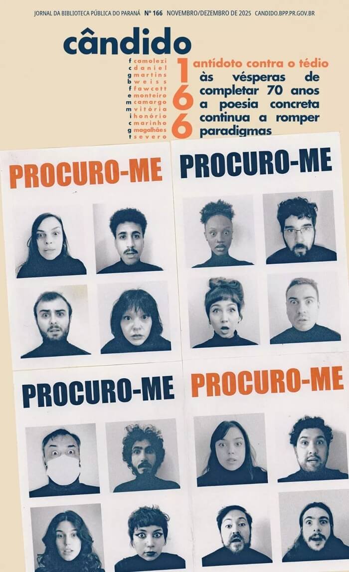 O Cândido 166 lança uma edição especial dupla, dos meses de novembro e dezembro, com mais conteúdos, todos seguindo o padrão do jornal: inéditos e exclusivos. A reportagem de capa, assinada por Francisco Camolezi, resgata a história da Poesia Concreta, movimento que completa 70 anos em 2026. A proposta, encabeçada pelos irmãos Campos, Augusto e Haroldo, com o poeta Décio Pignatari, deu origem à revista literária Noigandres, criada em 1952, e reuniu diversas formas de expressões artísticas além da literatura, como artes visuais e música, consolidando nomes referenciais nestas áreas. Na retranca, Claudio Daniel, poeta, romancista, crítico literário e professor de literatura analisa o recém-lançado livro de Augusto de Campos, Pós-poemas, que integra uma tetralogia formada por três outras obras: Despoesia (1994), Não (2003) e Outro (2015).