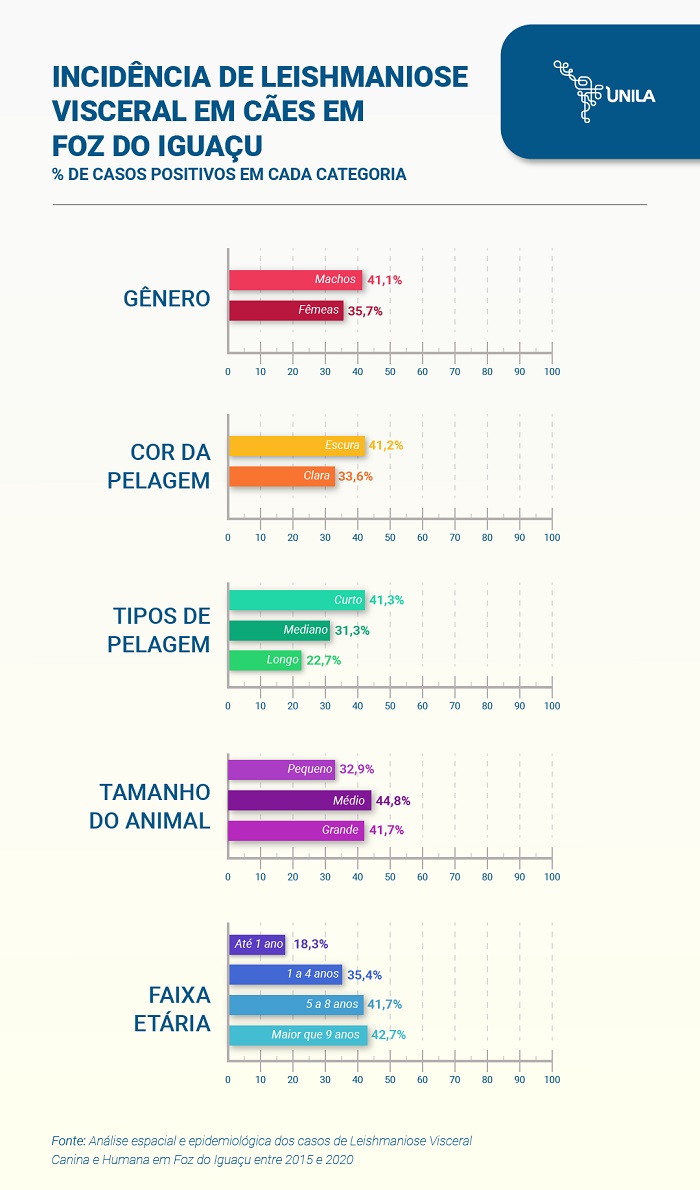 O estudo foi publicado pela revista Acta Tropica. Além da cor, o tipo de pelagem também pode ser um fator de risco. Cachorros com pelo curto tiveram 41,2% de incidência da zoonose. Já entre os de pelo mediano, a incidência foi de 31,3%, e entre os de pelo longo, 22,7%. Cães machos foram mais infectados do que as fêmeas, com 41,1% e 35,7% de positividade, respectivamente. E a LVC é mais comum em animais mais velhos, maiores de 4 anos de idade.