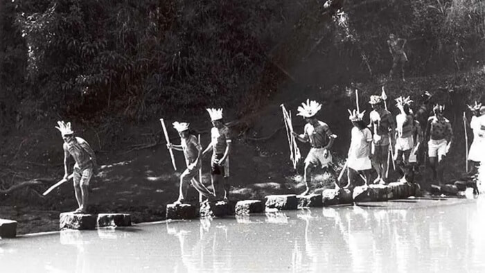 Imagem mostra indígenas da etnia Kaingang na travessia de um rio. — Divulgação/Editora Telha