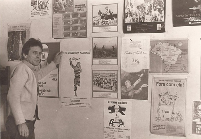 Juvêncio Mazzarollo, em 1984, diante de cartazes pedindo o fim da ditadura e liberdade política no Brasil – Foto: acervo Anna Rebecca Mazzarollo