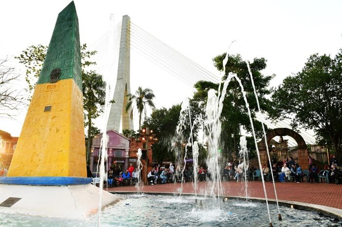 Marco das 3 Fronteiras tendo ao fundo uma das torres da Ponte da integração (Brasil – Paraguai) – Foto: divulgação