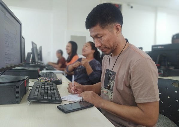 . Dificuldade igual enfrenta Artur Olímpio Miguel, também estudante de Antropologia. “Eu nunca mexi num computador desse tipo [desktop]. Tenho dificuldade para escrever com o teclado”, diz ele, que está acostumado com os comandos do telefone celular e escreve seus textos no aparelho. “O curso está ajudando muito. Não tive aulas antes. Quero sair sabendo mais. Ser na língua tikuna ajuda”, enfatiza.