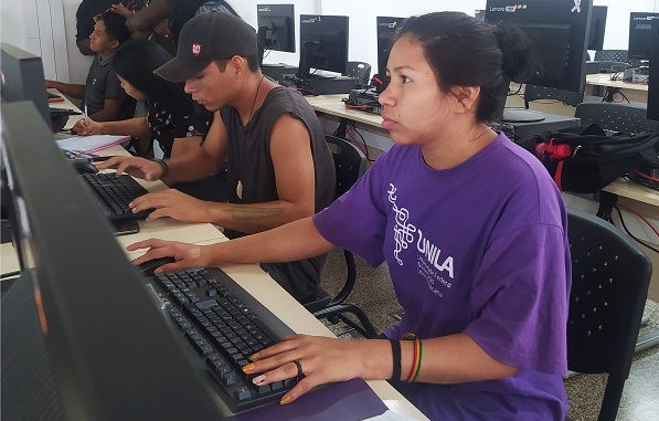 . O desejo de ajudar seus parentes – como os tikunas tratam os que são da mesma etnia – também move a monitora Jhine Flores Peres, aluna de Economia que chegou à UNILA em 2019. “Quando cheguei, eu tinha a mesma dificuldade. A rotina da universidade não é fácil. Eu tive problemas, além da informática, com a matemática. Depois eu aprendi com os monitores. Eles me ensinaram”, lembra.