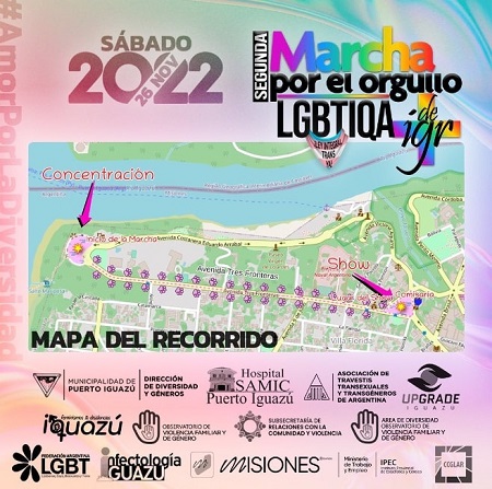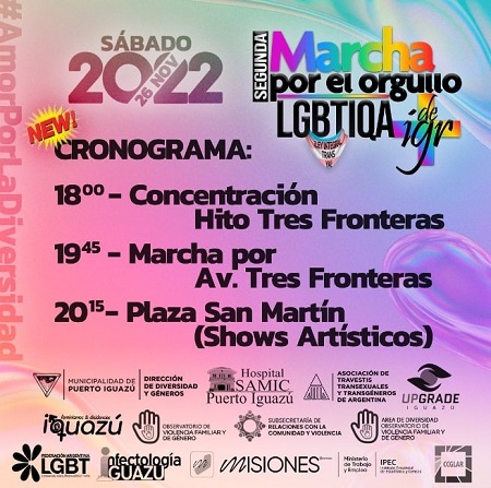 A cidade fronteiriça de Puerto Iguazú receberá, neste sábado (26), a II Marcha do Orgulho LGBTQIA+, organizada em parceria entre o poder público local (que possui uma Direção Municipal de Diversidade e Gêneros) e entidades como a Federação Argentina LGBT e a Associação de Travestis, Transexuais e Transgêneros da Argentina.