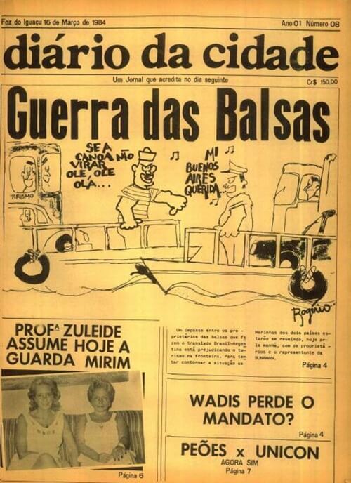 Com direito a charge na capa e fotos que retratavam o movimento de embarcações, o episódio da “Guerra das Balsas”, na travessia entre Brasil e Argentina, foi destaque do jornal Diário da Cidade, em 1984. À época, vale lembrar, a conexão entre Foz do Iguaçu e Puerto Iguazú ocorria pelo rio. O impasse chegou a afetar o turismo e o comércio fronteiriços.