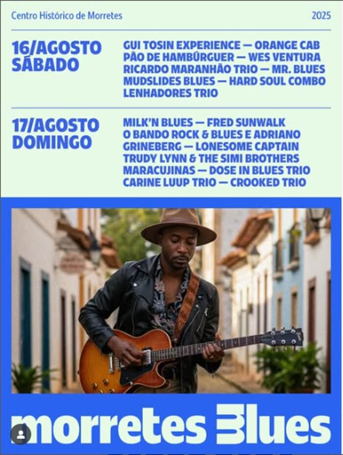 O Morretes Blues Festival 2025 acontece nos próximos dias 16 e 17 de agosto (sábado e domingo), no Centro Histórico de Morretes, com programação durante todo o dia. As atividades são gratuitas, realizadas em palcos espalhados pela cidade. A agenda completa já está à disposição na página oficial do evento. Acesse o perfil oficial do evento no Instagram: @morretesbluesfestival.