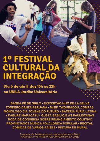 Apresentações artísticas marcam o 1º Festival Cultural da Integração, que ocorre na próxima sexta-feira (6), na UNILA-Jardim Universitário, das 15h às 22h. O evento tem como proposta promover a integração entre a comunidade acadêmica da UNILA – e também com outros moradores da cidade – em um contexto multicultural. O Festival é aberto ao público e gratuito. Todas as atividades serão realizadas por estudantes da UNILA oriundos de sete países – além dos brasileiros, integram o evento discentes do Peru, Haiti, El Salvador, Paraguai, Colômbia e Equador. Na programação, há atividade gastronômica de países latino-americanos, performance, recital de poesia, confecção de mural, além de apresentações musicais e de dança. Na ocasião, ocorre também uma roda de conversa sobre financiamento coletivo. O Festival marca o fechamento da recepção dos calouros, realizada pelo Programa de Acolhimento aos Estudantes Ingressantes em 2018, das pró-reitorias de Relações Institucionais e Internacionais, de Extensão e de Assuntos Estudantis. O evento visa, nesse sentido, ofertar também uma rede de apoio e acolhida aos novos estudantes, criando um ambiente de socialização e integração com a comunidade da Universidade e externa. Serviço: 1º Festival Cultural da Integração
