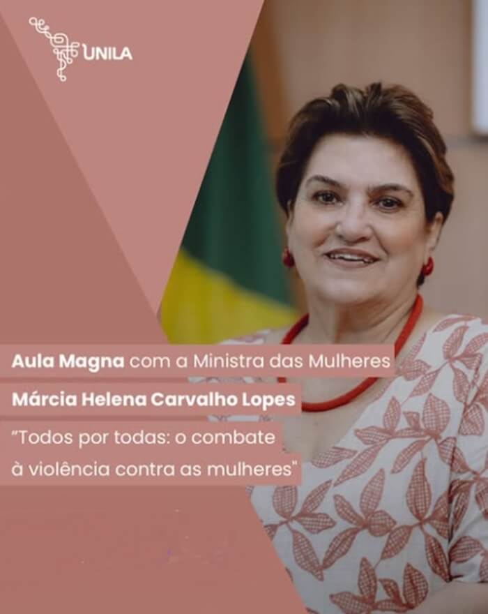 No dia 22 de abril, às 18h30, no auditório da Unidade Jardim Universitário, a UNILA realiza sua Aula Magna, em um momento de grande relevância institucional e social. A atividade contará com a presença da ministra das Mulheres, Márcia Lopes, que abordará o tema “Todos por Todas: o combate à violência contra as mulheres”. Aberta à participação do público externo de toda a região trinacional.