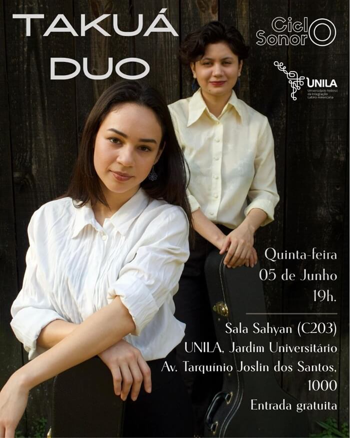 Nesta quinta-feira (05), o projeto Ciclo Sonoro apresenta recital do Takuá Duo, grupo de Assunção, Paraguai. A evento, com entrada gratuita e aberto à comunidade em geral, está marcado para a Sala Sahyan (C203), no campus Jardim Universitário, da Unila, a partir das 19 horas.