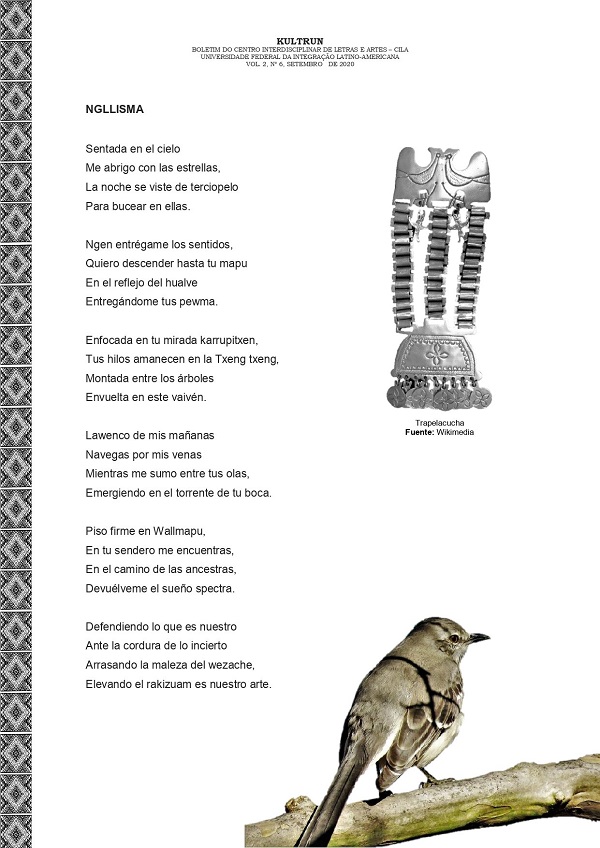 Reproduzido do Boletim Kultrun, publicação do CILA / UNILA. Volume 2, edição 6, setembro de 2020. . Ngllisma . Sentada en el cielo Me abrigo con las estrellas La noche se viste de terciopelo Para bucear en ellas. Ngen entrégame los sentidos, Quiero descender hasta tu mapu En el reflejo del hualve Entregándome tus pewma. […]